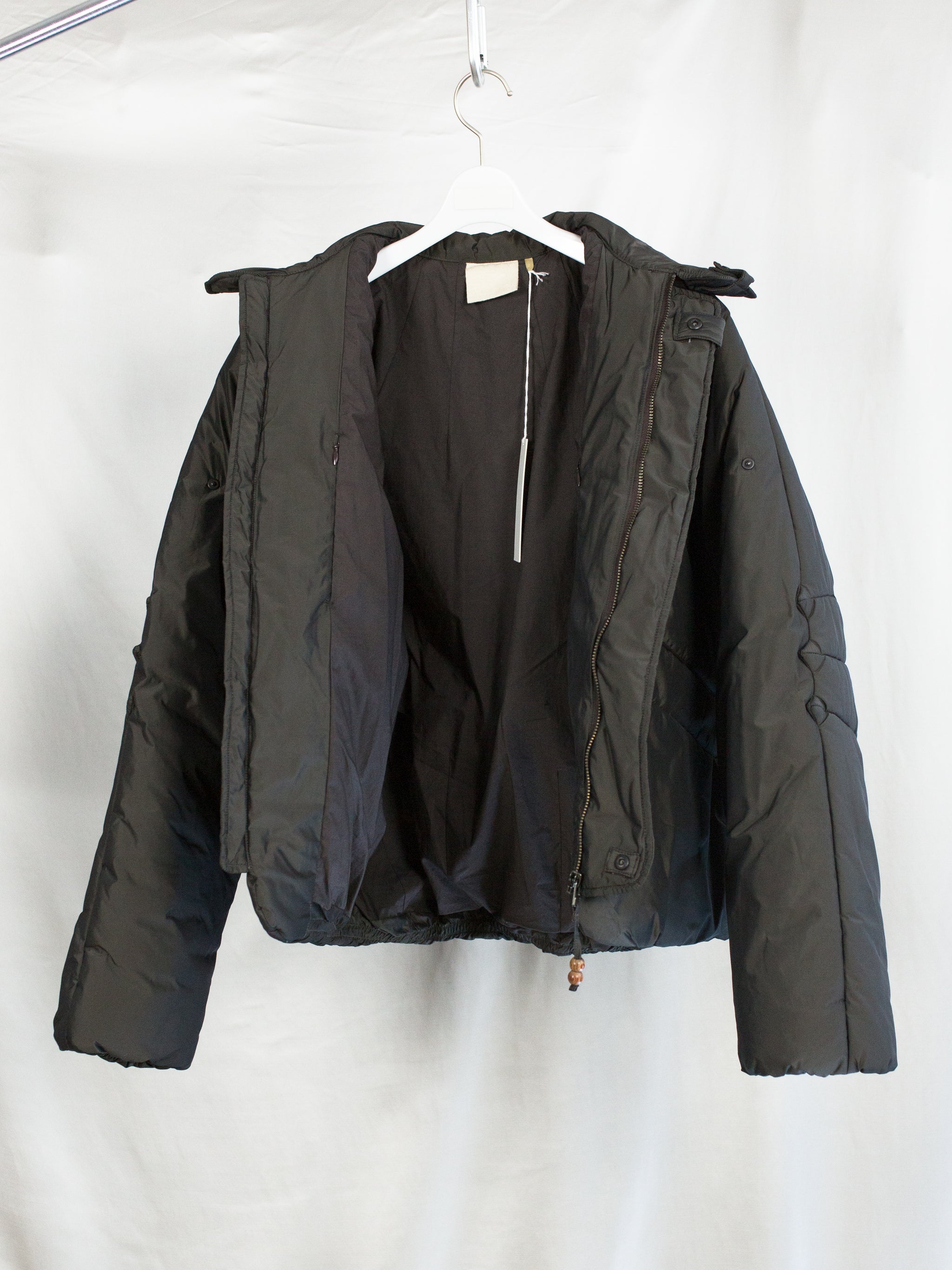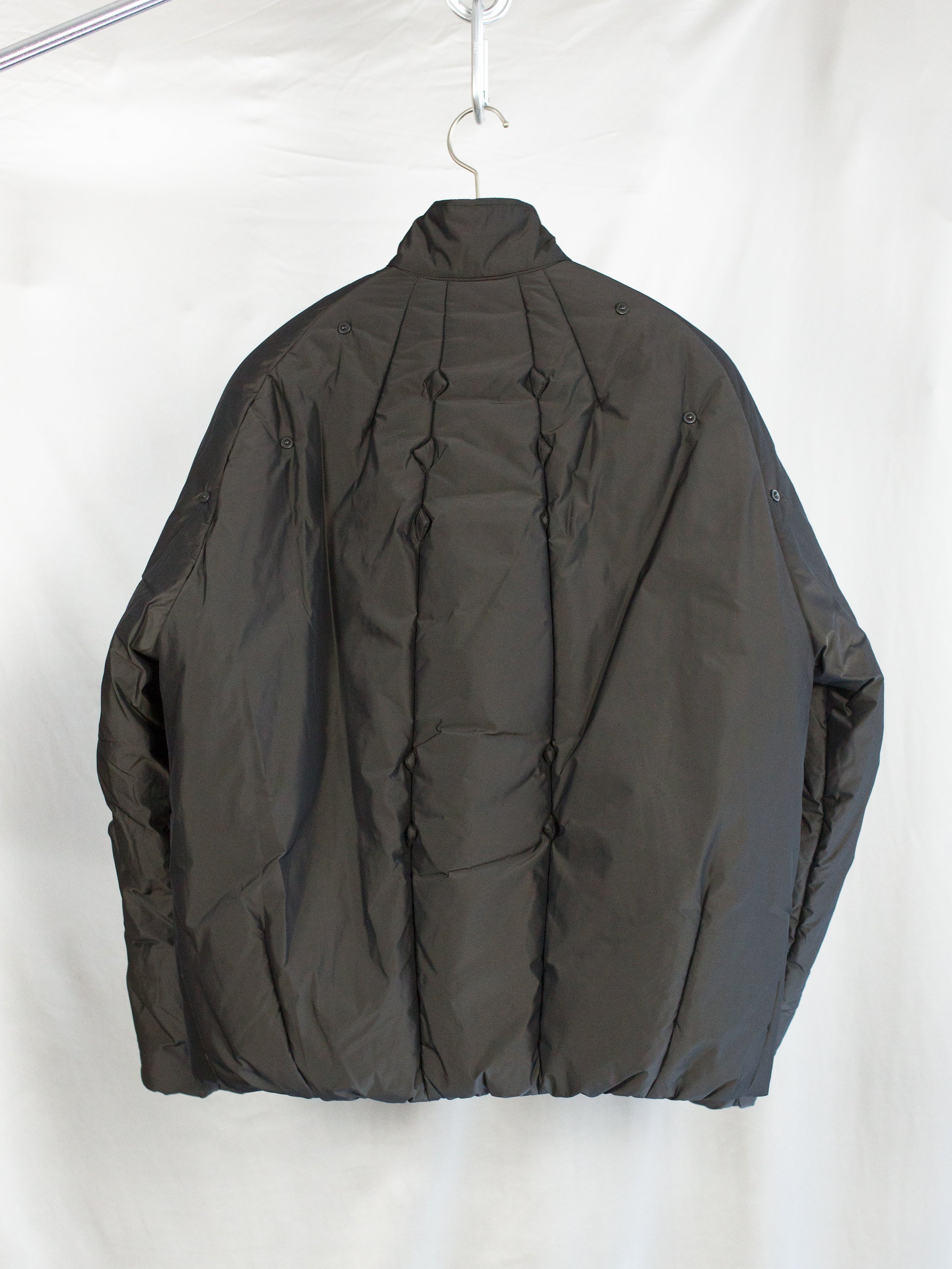 Puffer jacket in purple/brown lightweight iridescent nylon with dart-sculpted round body. Padded spikes are sewn into the darted construction at elbows and back. Brand signature riveted circles surround the shoulder. Double zip front closure with 'gourd' stacked wood bead top zipper pull. Snap collar latch folds inwards and can be secured when not in use. Front waist pockets feature invisible zipper closure. Hem and cuffs feature internal elastic for a clean finish.
