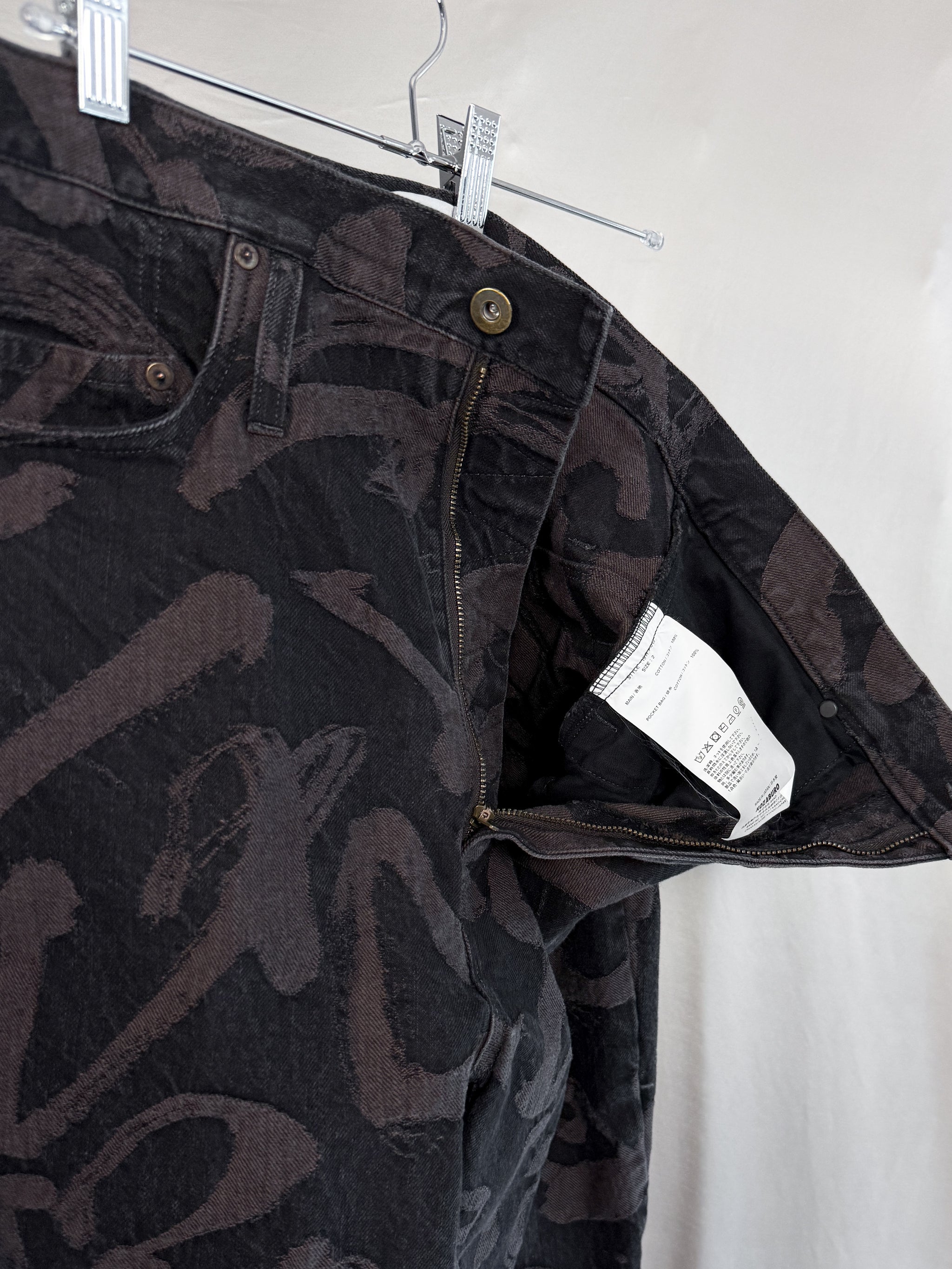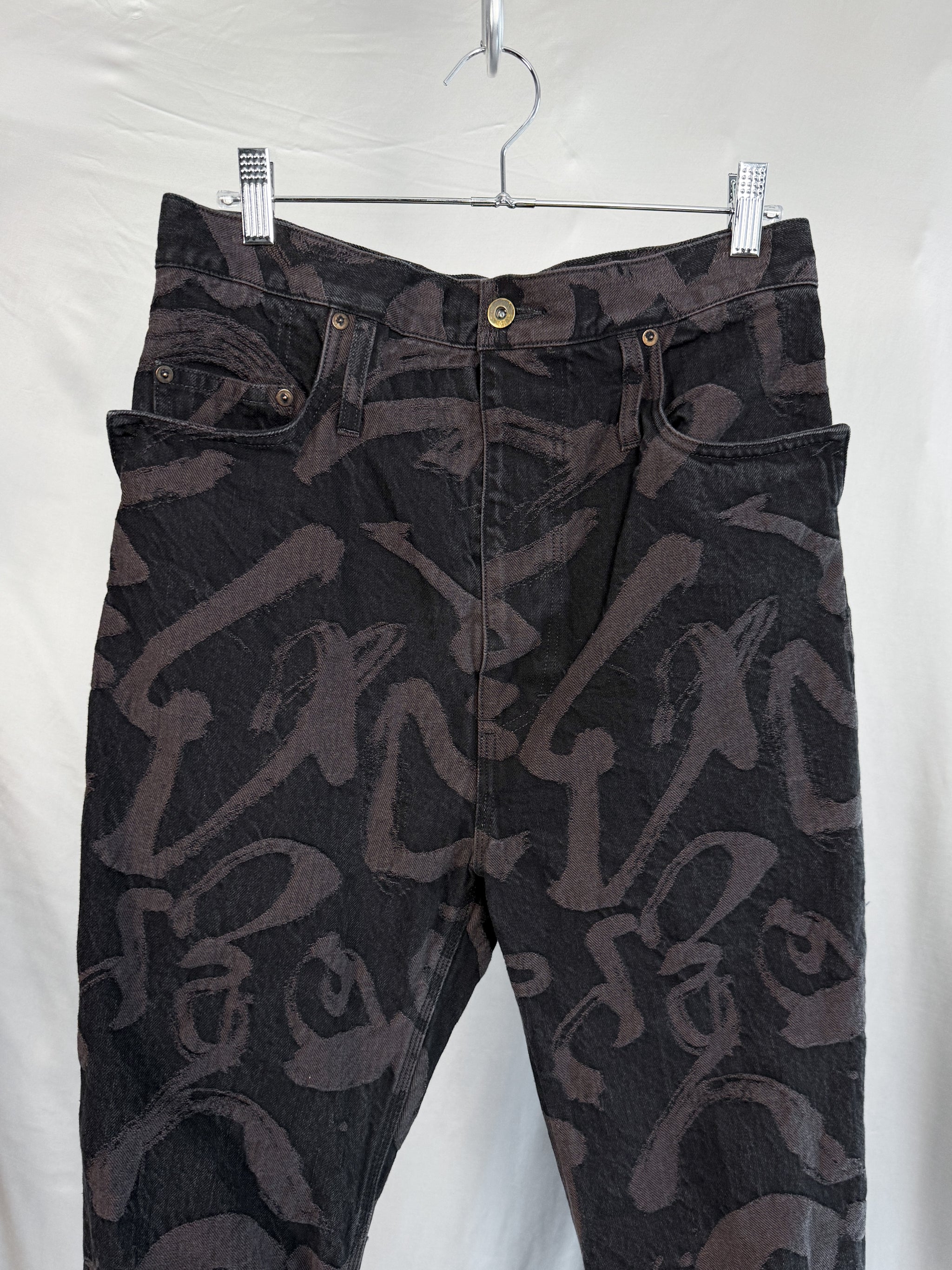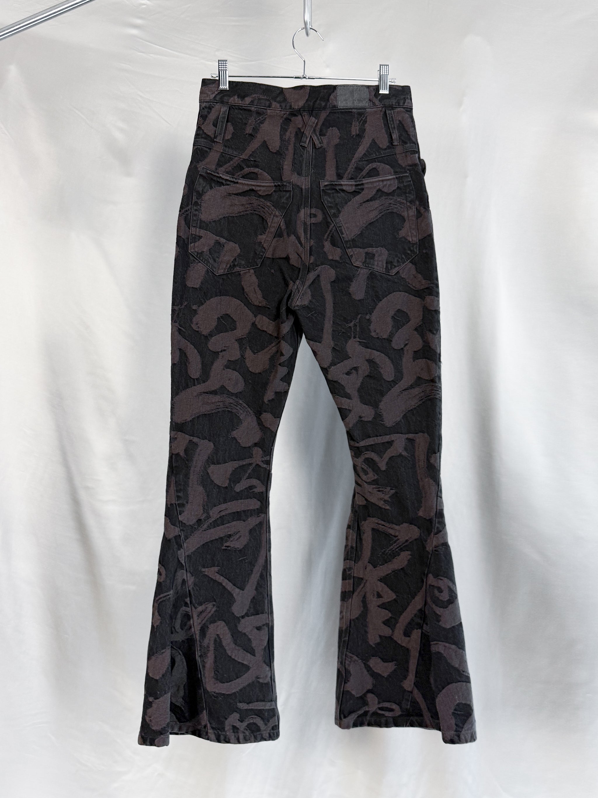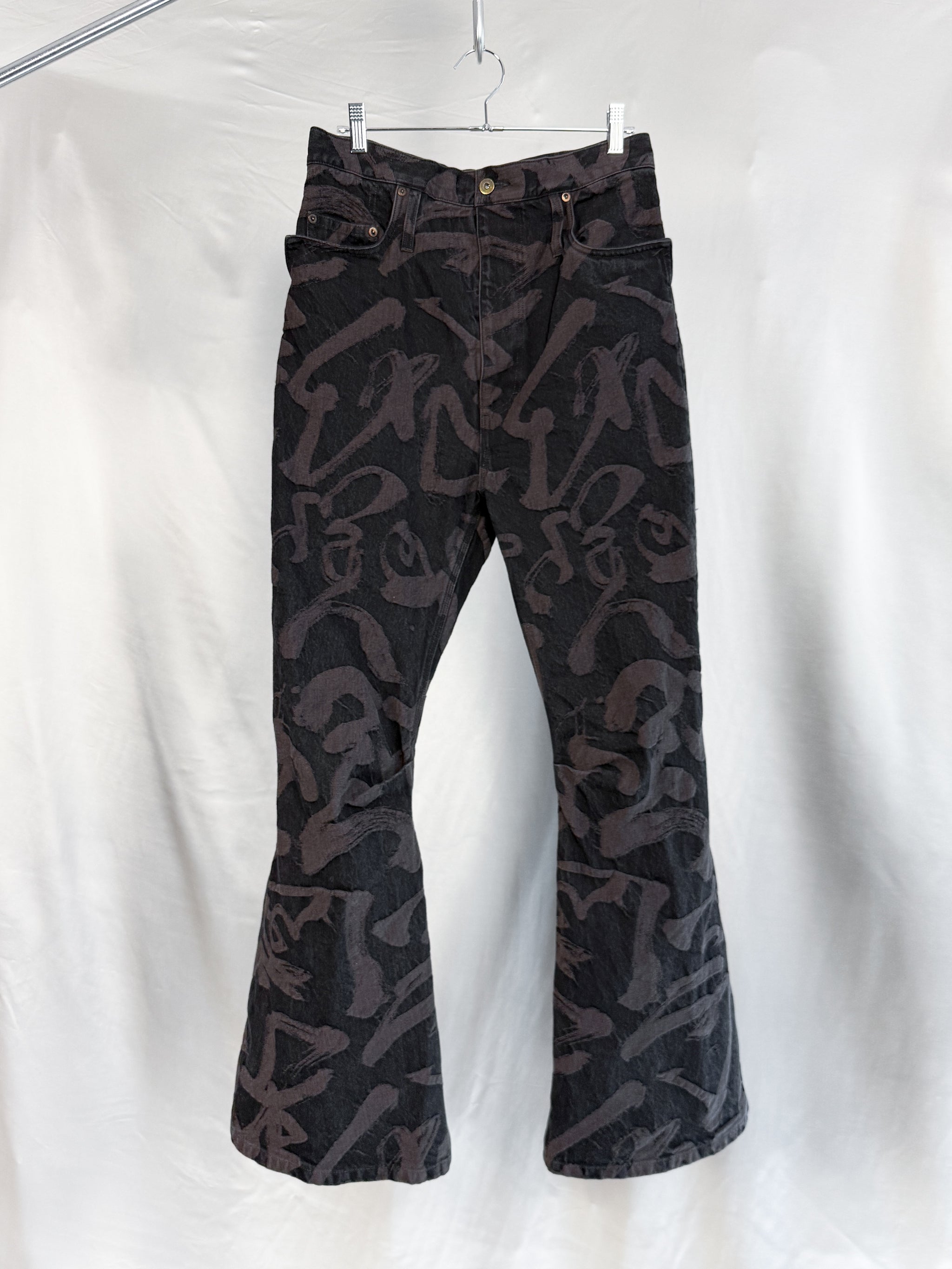 Calligracamo jacquard woven denim in Kozaburo's signature long 3d bootcut. Twisted seamlines create off-body structure. Button shank frotn closure with zipper fly. Antique brass rivets throughout.