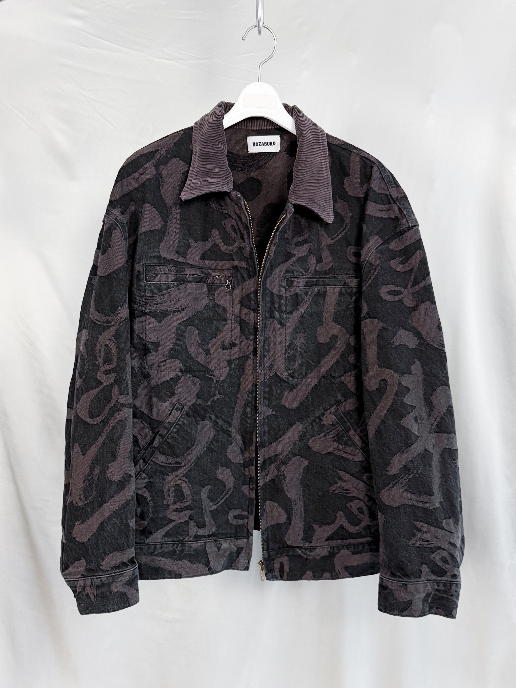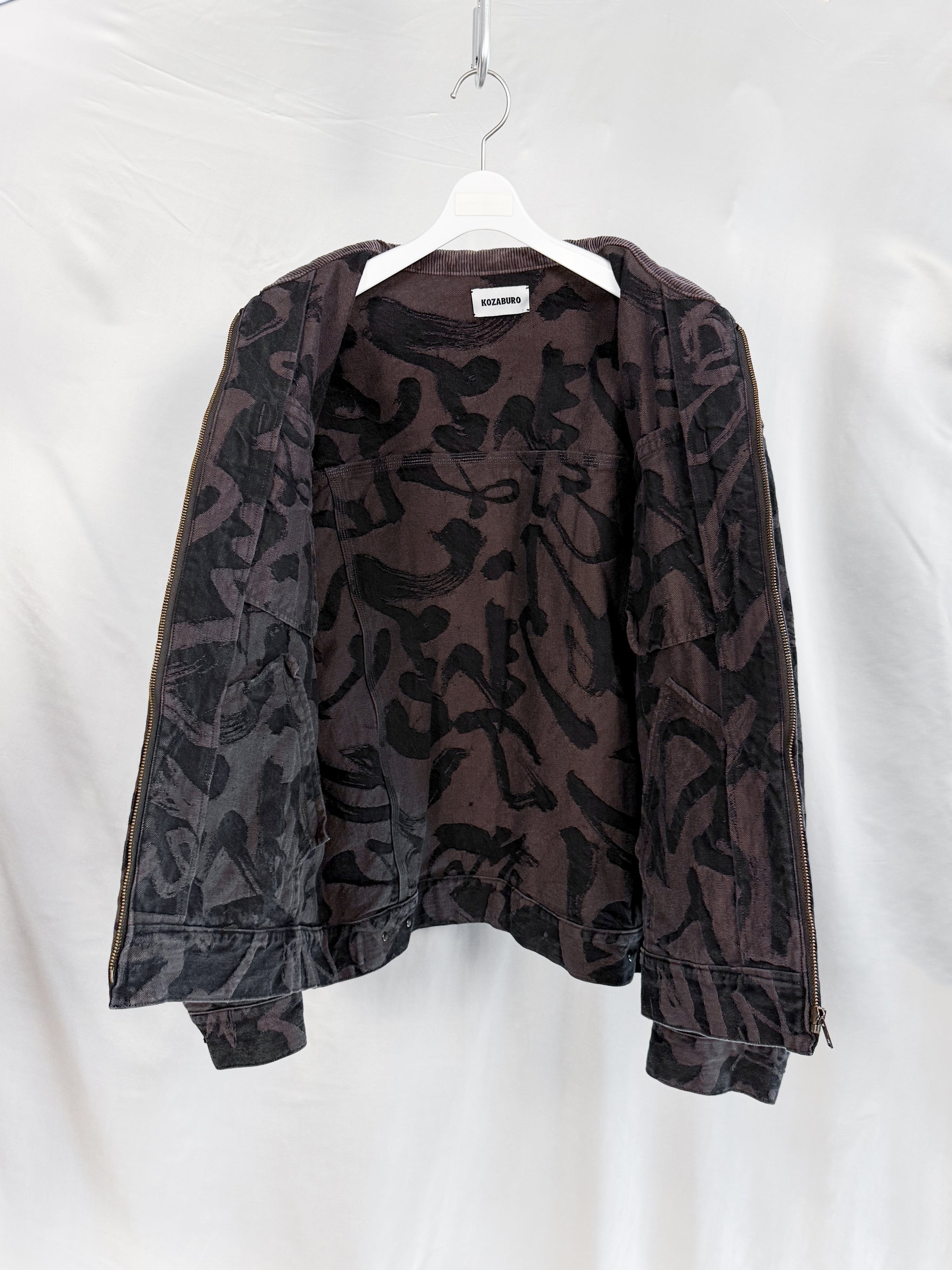 Zip-up trucker jacket in brown and black jacquard denim featuring Kozaburo 'Calligracamo' pattern. Contrast brown corduroy collar. 4-pocket front and slightly elongated body combines denim and chore jacket styles.