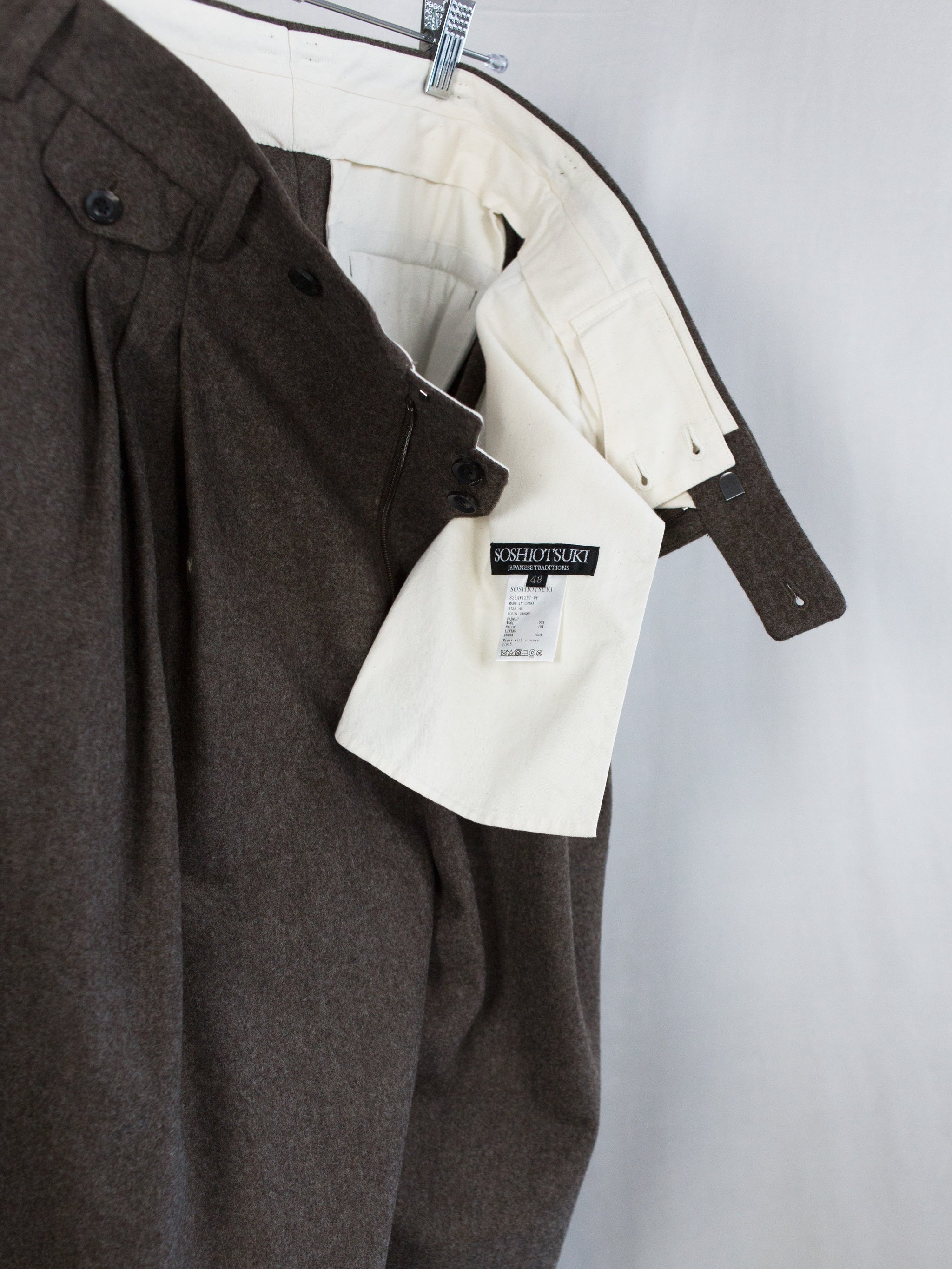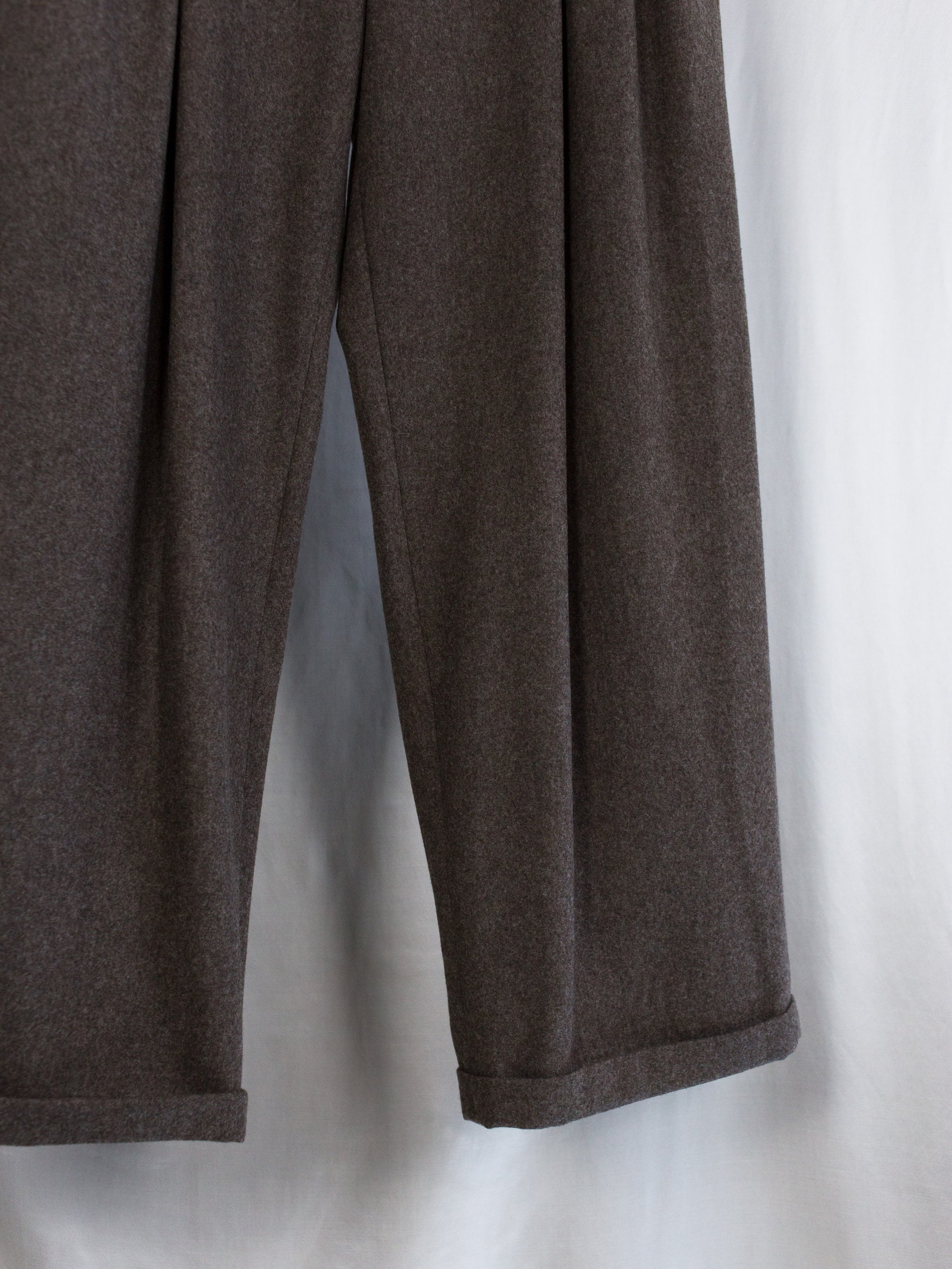 Triple pleated suit trousers in midweight brown wool flannel, with flap-closed coin pocket at wearer's right hip and internal waist retainer inspired by traditional tailoring. This allows for the trouser to be worn semi-open, subverting the formality of a tailored garment. Slightly dropped belt loops, two slash side pockets and two flap-closed back welt pockets. Signature figure 'S'-sewn buttons. Dual button + hook and bar waist closure.