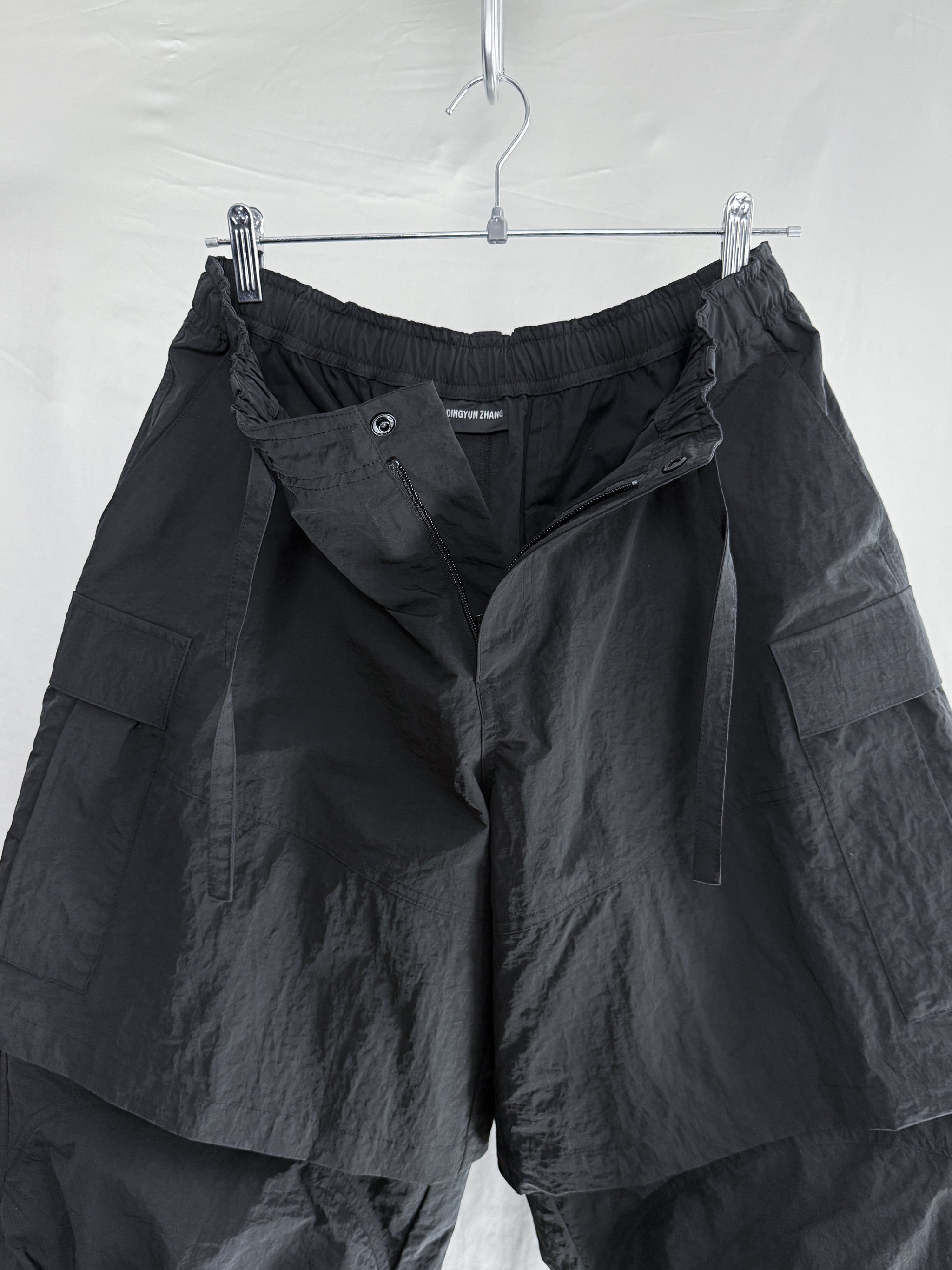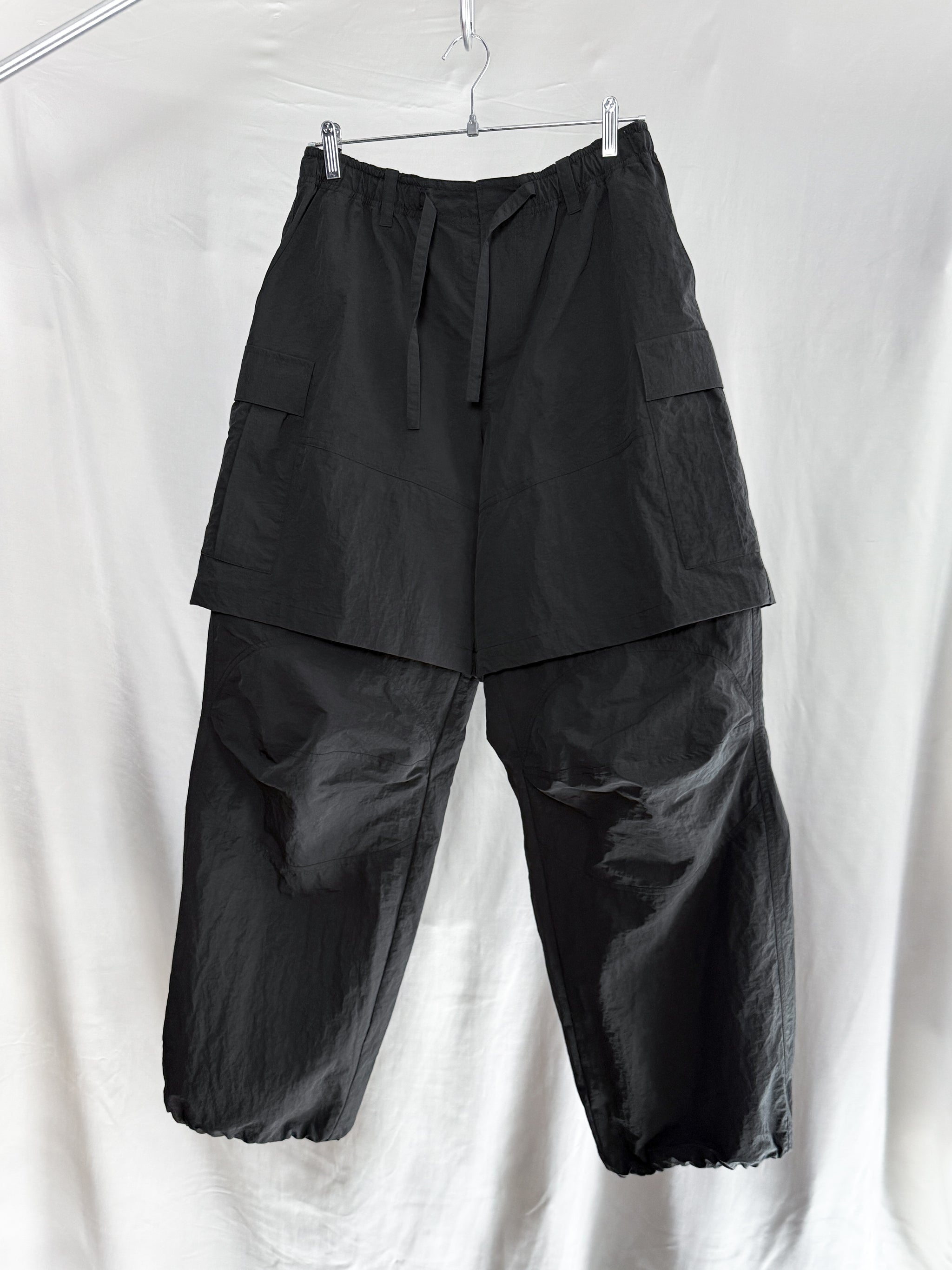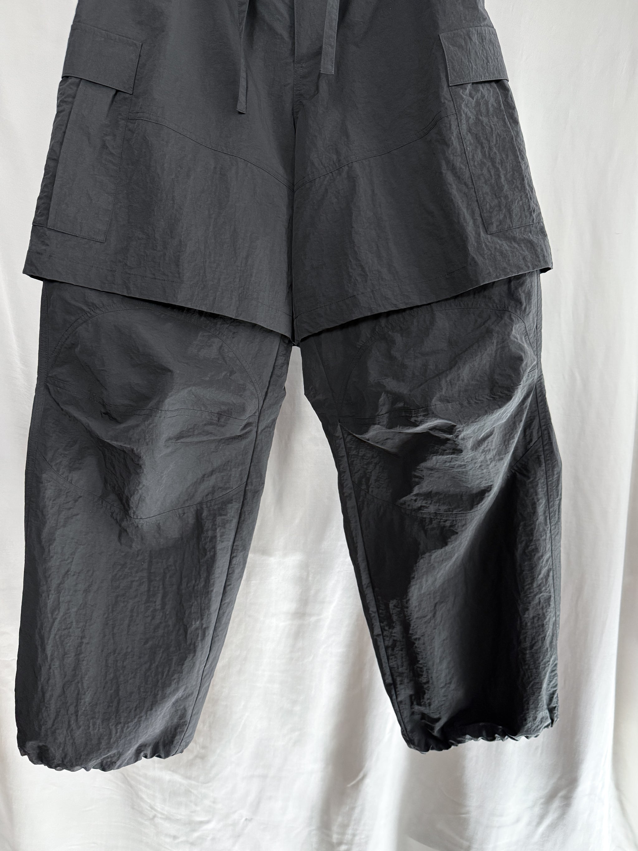 Convertible cargo short-pant hyrid with layered look. Structured crinkle nylon sits off-body. Ovular knee panel creates 3D articulated shape. Snap waistband with zipper fly. Elasticated + drawstring waistband.